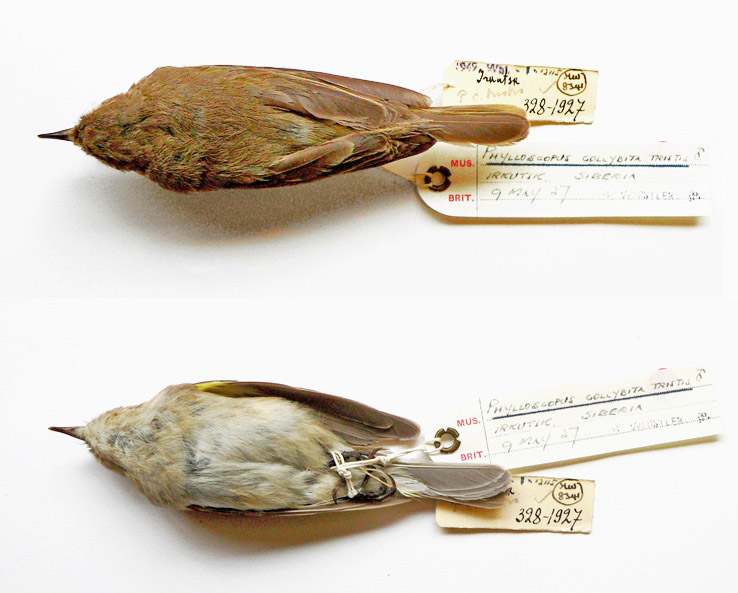 Unfortunately, the photographs of specimens which appeared in the paper 'Siberian Chiffchaff revisited' (Dean & Svensson, 2005, British Birds 98:396-410) were badly underexposed and suffered from correspondingly inadequate colour reproduction. Colour-corrected versions are reproduced below.