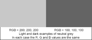 Thus, (200, 200, 200) is a pale 'neutral grey' while (100, 100, 100) is a dark 'neutral grey'. In the term 'grey and white' livery applied to Chiffchaffs, the label 'grey' is intended to convey a prominent component of a 'grey' shade resembling 'pale neutral grey' in Smithe's 'Naturalist's Color Guide' or shades in the range 2 to 3 on the Kodak Grey Scale.